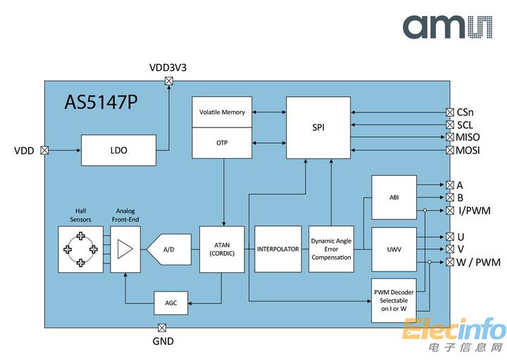 AS5147P在轉(zhuǎn)速最高達(dá)28000rpm的情況下仍能提供精確的絕對和增量測量輸出,特別適用于對安全有較高要求的應(yīng)用,如電動轉(zhuǎn)向(EPS)、剎車和油門的踏板、泵、雙離合變速箱、起動電機(jī)、交流發(fā)電機(jī)以及雨刮器電機(jī)。