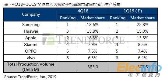 4Q18~1Q19 全球前六大智能手機(jī)品牌市占率排名與生產(chǎn)總量