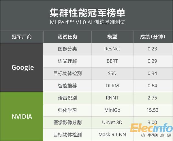 谷歌與NVIDIA在集群系統(tǒng)測(cè)試中展開(kāi)激烈冠亞軍爭(zhēng)奪,最終谷歌獲得了ResNet、SSD、BERT和DLRM四項(xiàng)任務(wù)的第一,NVIDIA則奪得U-Net3D、Mask R-CNN、RNN-T和MiniGo四項(xiàng)任務(wù)冠軍,雙方平分秋色。在單機(jī)系統(tǒng)測(cè)試中浪潮獲得ResNet、SSD、BERT和DLRM四項(xiàng)任務(wù)的冠軍,NVIDIA獲得RNN-T和MiniGo兩項(xiàng)第一,Nettrix獲得U-Net3D、Mask R-CNN兩項(xiàng)第一。